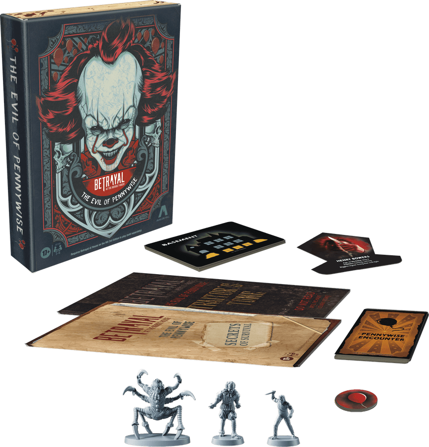 Inspired by the It Chapter Two movie based on Stephen King's novel It, the Betrayal at the Neibolt House: The Evil of Pennywise expansion features five terrifying haunts and includes three highly-detailed character figures, new rooms to explore, new card, tokens, and more!