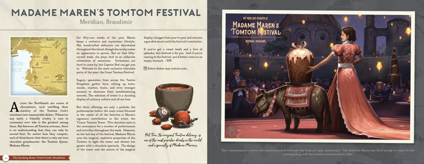 The Travel Guide is a 48 page art book featuring art and info describing the Wonders you will find on a Smoking Bones expedition. While the Travel Guide is not an adventure story itself, each Wonder entry tells its own tale of magic and discovery. Some Wonders are environmental marvels. Some magically tickle the taste buds. And some Wonders rip the mind open to unlock the mysteries of the universe. Best take your coat.