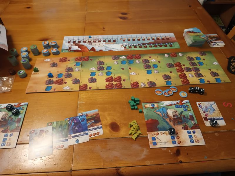 In Creature Caravan, players build a card tableau of creatures while traveling through a magnificent and dangerous land. Players take turns simultaneously, placing dice on actions on their cards, moving their caravan on the map, and playing new creature cards. Players also compete to trade goods and rare coins in a shared market, search the mysterious white towers, and fight ember zombies as they travel. The game ends when one player reaches Eastrey. The player with the most points wins.