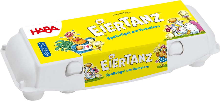 This is a game that comes in a real egg-box. There are nine yellow plastic eggs and one yellow wooden egg (worth 2 points, the others are worth 1 point) and two dice, one red and one white. Although it is, in fact, a children's game, it is great fun when played by adults as well.