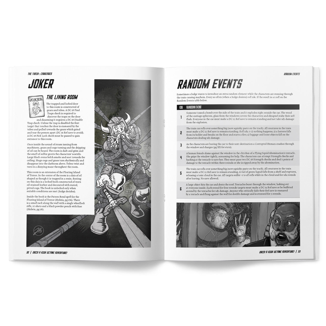 The adventure doesn’t have a map, instead it uses playing cards to generate the map at random. Each time a GM runs it, not only will the adventure be different based on player decisions, the map itself will be different. Many of the rooms have random events that occur to spice things up even more. It even includes a new Hubris/DCC class, the Gunslinger!