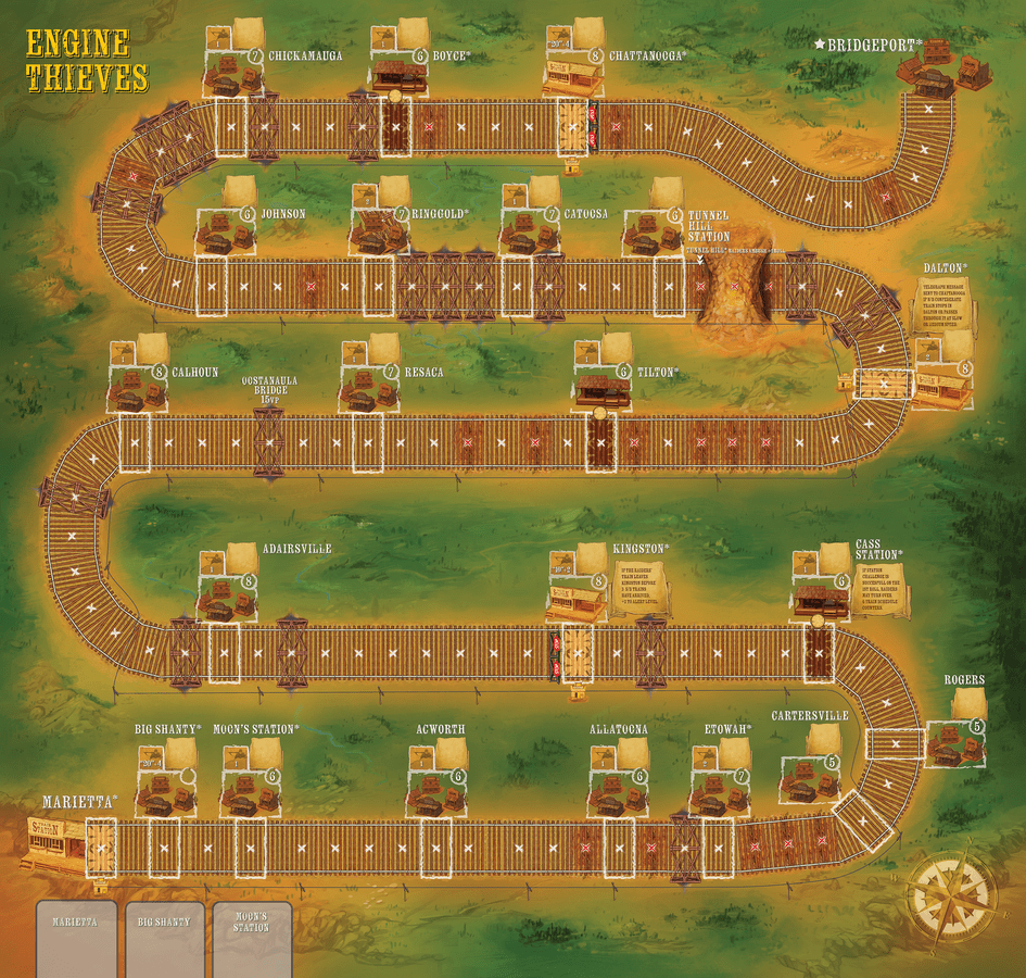 Engine Thieves covers this courageous Civil War raid. Play as the Union raiders in a solo game as you race against time, and the Confederate soldiers on your tail, to get to Bridgeport. With two players, one of you will play as the Confederates and try to stop your opponent from reaching Bridgeport or at least minimize their destructive sabotage. Follow the adventure and real path these raiders took on their daring ride north!