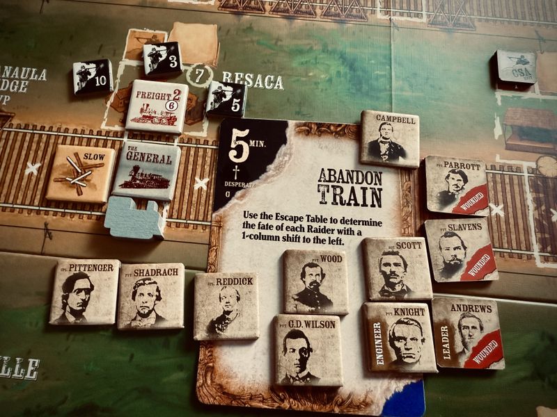 The game ends when the Raiders player either passes through Chattanooga and reaches Union General Mitchel in Bridgeport, must abandon the stolen train, all Raiders are killed or captured, or the time track reaches 4:00pm.