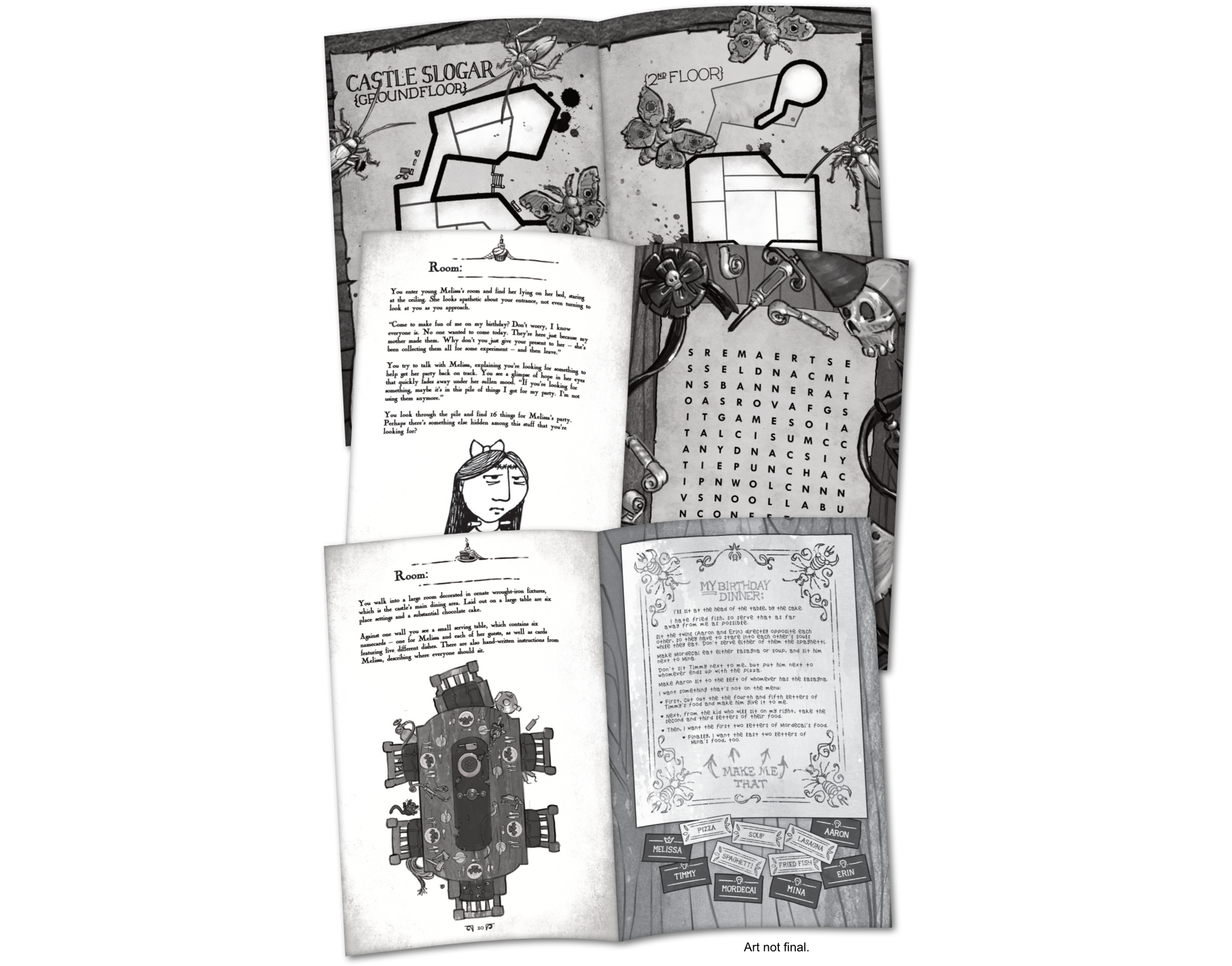 Unhappy Birthday at Castle Slogar is a sorrowful solo gamebook filled with interactive puzzles. A full map of the castle shows which rooms you've explored. The book's sections describe each room, where you'll face a horrible hindrance or a character whose dismal dilemma you'll solve to access the next room. Having trouble? A special website provides hints and extra material. Unravel the riddles then use your answers to find the gloriously gloomy finale!