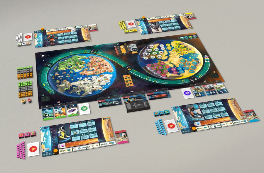 In Evacuation, life on our planet is being burned away thanks to increasingly intense sunlight, so everyone is trying to move all the people and factories in their territories from the "old" planet to a new one — and they have only four rounds in which to do so.