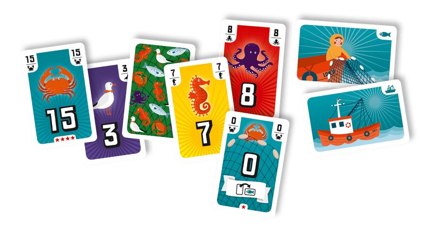 In Fishing, you try to catch as many tricks as possible over eight rounds, with each card you catch being worth 1 point. You then use your caught cards for the next round — and if you didn't catch enough tricks to fill your hand, you'll draw fresh cards from the ocean stack, which will introduce new cards for you fishers to fight over.