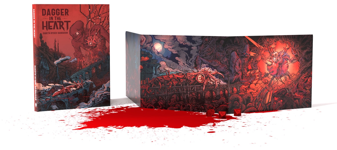 The Heart GM Screen is a three-panel landscape screen which depicts the sprawling vista of the Below, where the Delving Machine itself cuts through reality to reach the centre of the Heart.