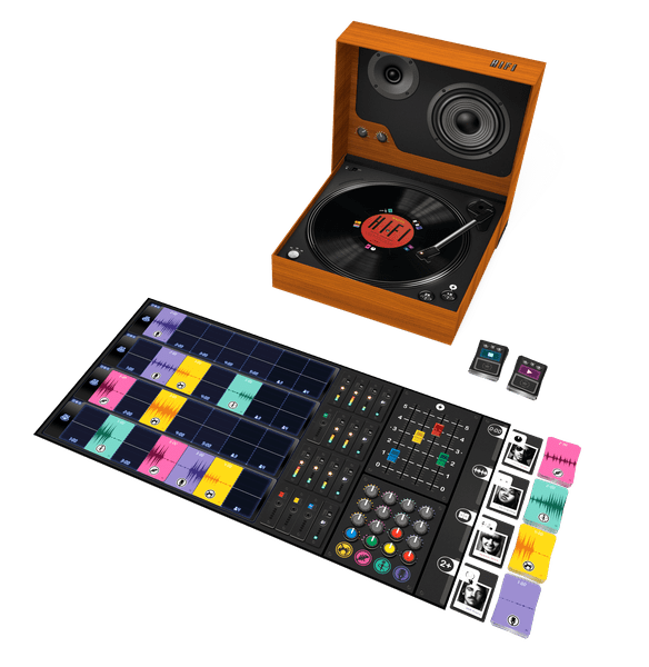 In HiFi, players start their turn by spinning the record's rondel on the turntable to choose an action within their reach, or they can spend production points to achieve one of the other actions. After resolving these actions, players allocate audio cards to the five studio tracks, earning points based on the buttons in that producer's equalization track and what's in the studio track. When a player allocates a guitarist card, each player who collaborated with the equalization of the guitar earns points. When elements such as sound wave or time-track positions match, players can perform bonus actions.