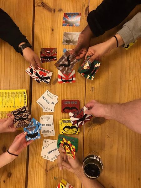 I Mustache U is a social party game where players use cards to make predictions about each other and earn points for predicting correctly. At the end of the agreed number of rounds, the player with the most points wins. In the event of a tie, participants can either declare the leading players co-winners or have the point leaders enter an elimination round where they take turns being dealer until one player earns a point and others do not.