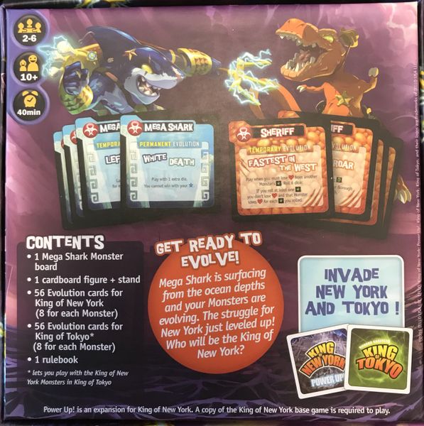 With King of New York: Power Up!, Captain Fish, Sheriff, and their fellow monsters now have two unique sets of evolution cards (112 cards total) for both King of New York and King of Tokyo — and a new challenger joins them: Mega Shark!