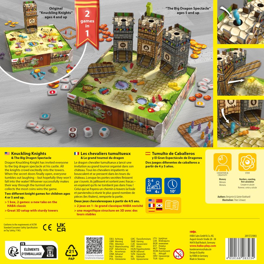 Dragon Knuckling Knight has invited everyone to the big dragon spectacle at his castle. All the knights crowd excitedly into the towers. When the secret doors finally open, everyone tumbles out laughing – but hopefully they won’t fall into the water! Whoever successfully makes their way through the turmoil and collects the most coins wins the game.