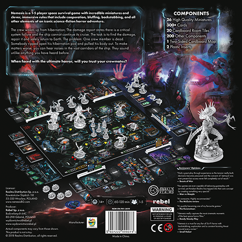 Nemesis is a 1-5 player space survival game with incredible miniatures and clever, immersive rules that include cooperation, bluffing, backstabbing, and all other elements of an iconic science-fiction horror adventure.