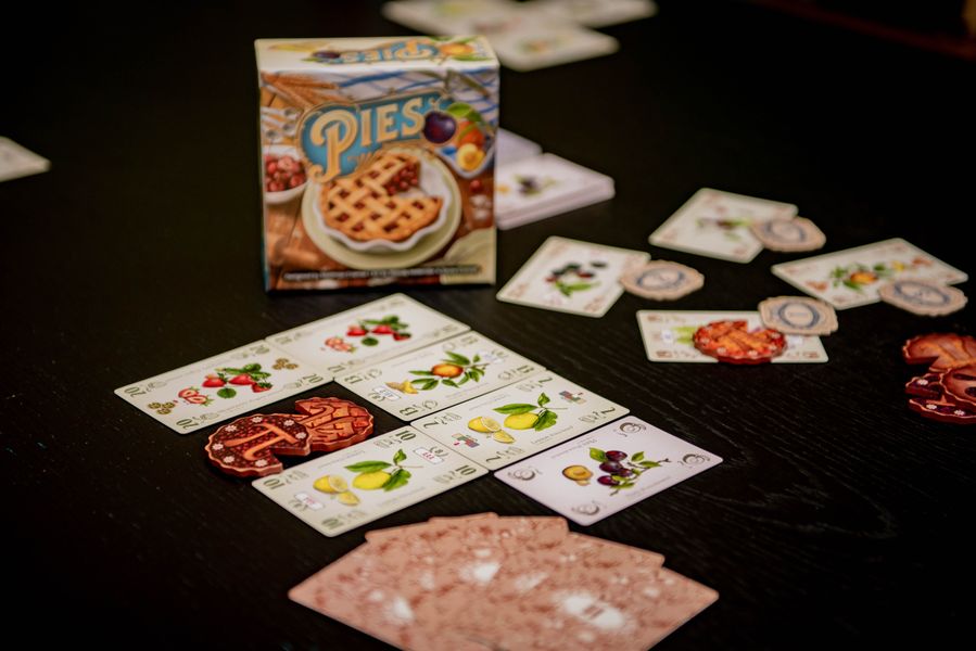 Pies is a quick and tasty trick-taking game in which players play fruit cards over the course of three rounds with the goal of collecting combinations of ingredients to prepare the tastiest pies