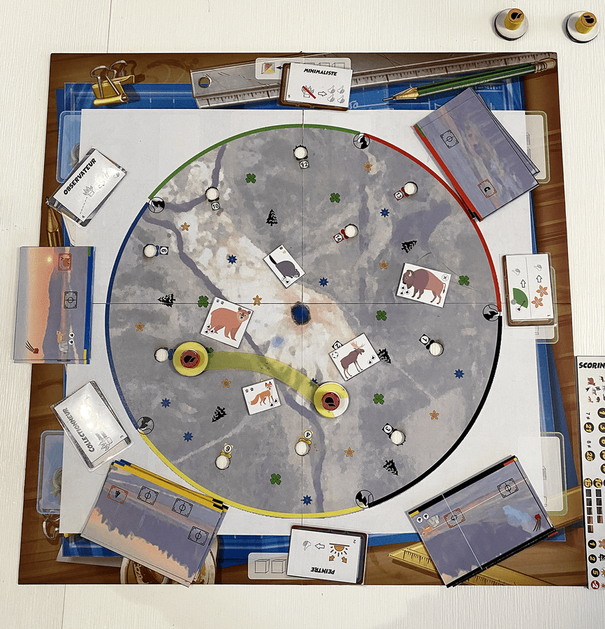 During their turn, each player will have to choose between different movements and their angle of view (materialized by real plastic elements) to catch the animals in the picture (without disturbing them).