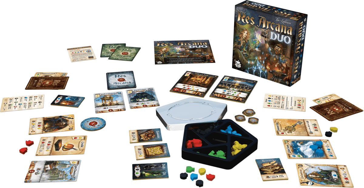 Res Arcana Duo is both an expansion for Res Arcana (with 35% more cards) and a standalone, two-player game that can be later combined with Res Arcana and its other expansions Lux et Tenebrae and Perlae Imperii.