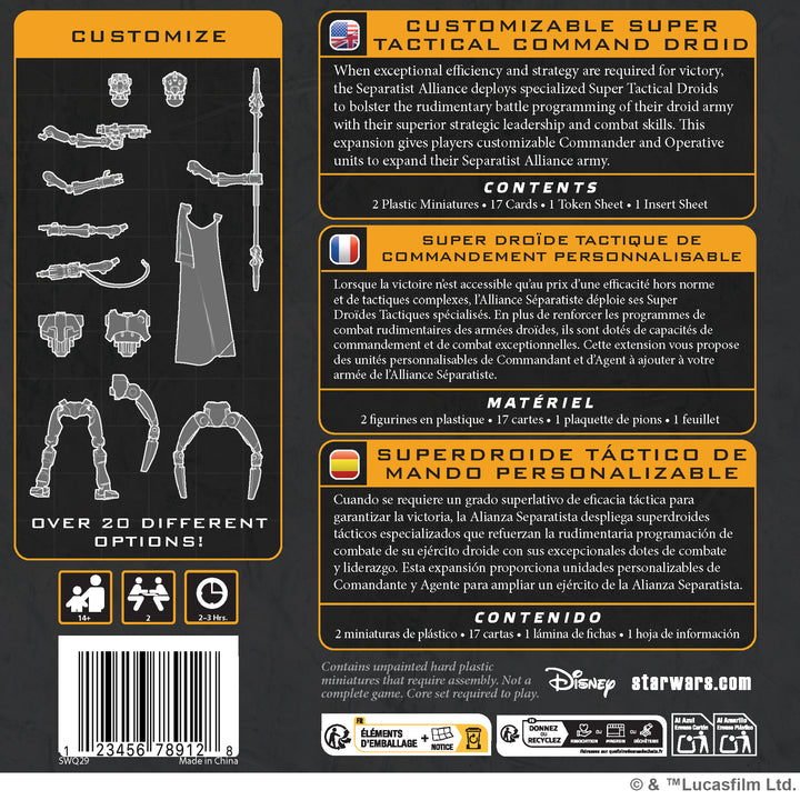This pack includes over 20 optional parts players can choose from when assembling their miniatures, allowing for a huge range of personal customization for each character. Players also customize their Tactical Command Droid in-game abilities using the 13 unique Upgrade Cards included in this expansion. Each of these unique upgrades dramatically changes the battlefield role, abilities, and synergies the character brings to the army.