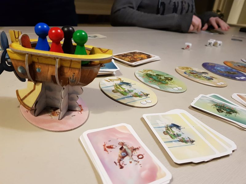 At the beginning of a journey, all players place their pawns within the aircraft; the players start the game with six cards in hand (or eight depending on the number of players). At the beginning of each round, one player is chosen to be the captain of the trip and he rolls 2-4 dice to discover the challenges that they will face: fog, lightning bolts, killer birds, or pirates. He must then play the appropriate cards — a compass, a lightning arrester, a foghorn, or even cannons — to continue on the journey and reach the next city. But before the captain plays the appropriate cards, each player must decide whether to stay within the aircraft: