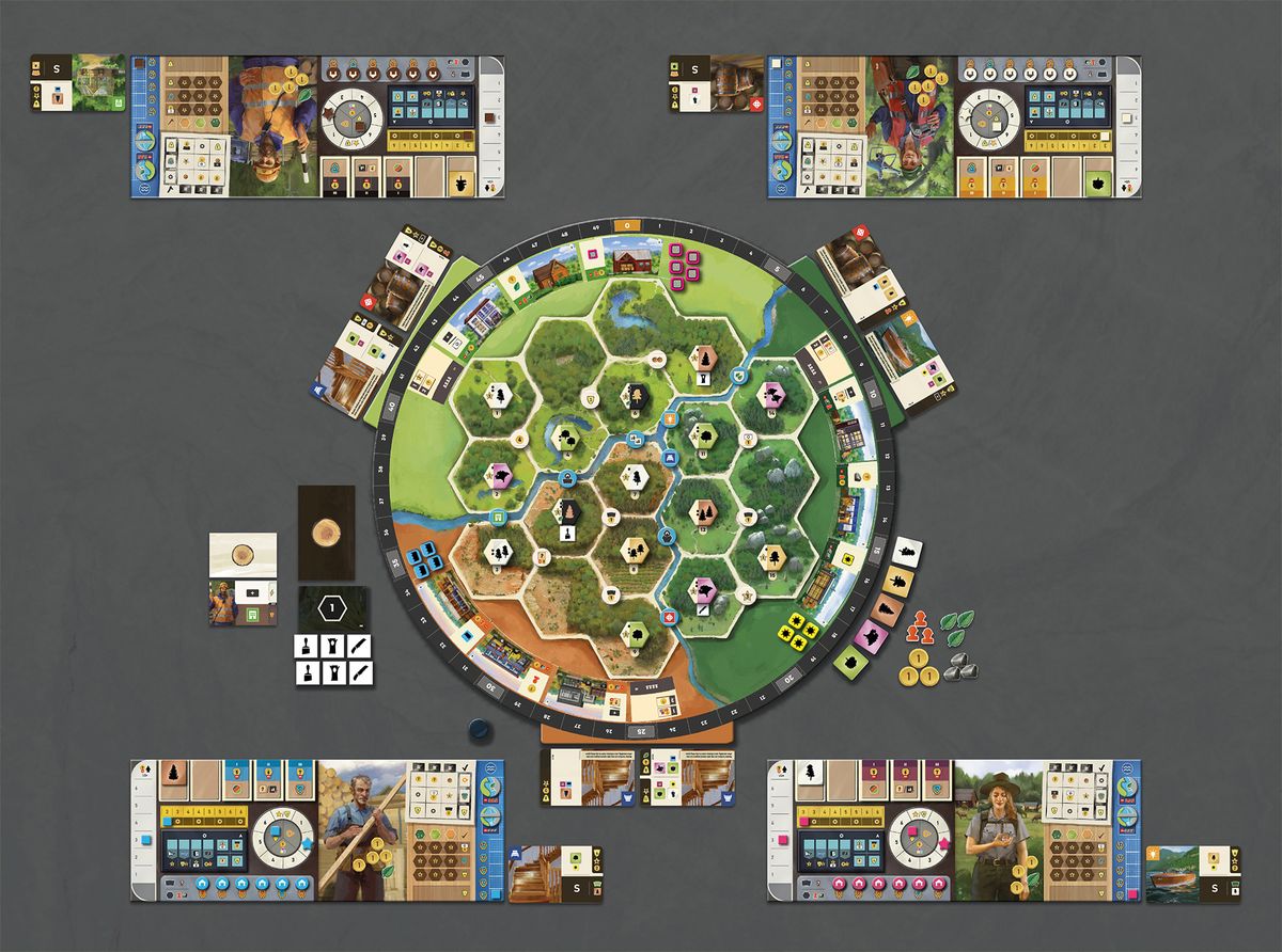 As a Eurogame focused on strategic action management, Forestry relies on a dual-worker system in which players control a harvester and a manager, each with distinct responsibilities. The harvester moves through the forest, felling trees to meet contract demands, replanting saplings, constructing infrastructure, and adjusting water retention to promote a healthy ecosystem. Meanwhile, the manager oversees resource collection, utilizes sawmill buildings, fulfills contracts, and optimizes wood processing. Players must carefully allocate action points between these workers to make sustainable choices, enhance infrastructure, and ensure the forest thrives while meeting demand.