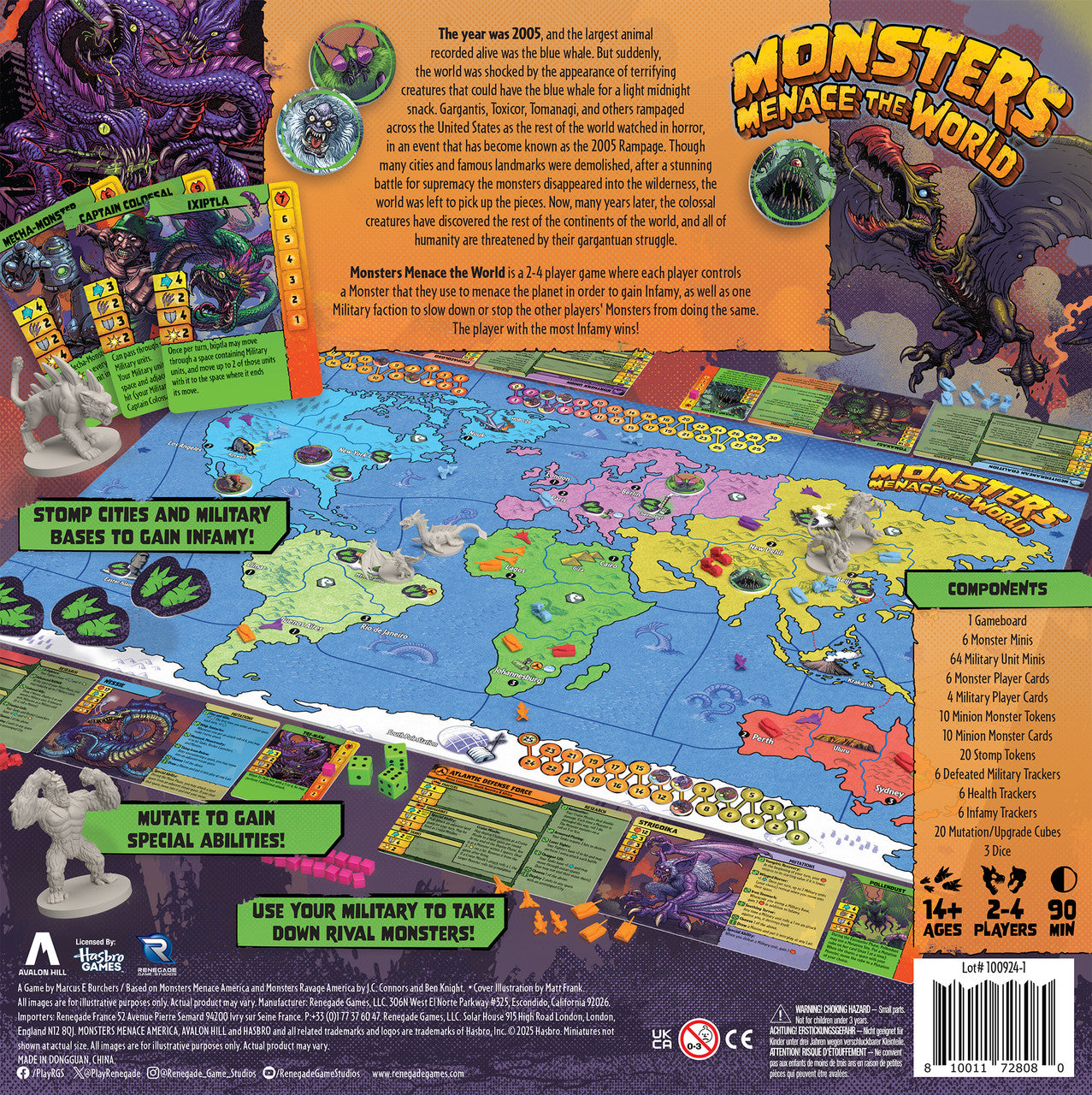 Monsters Menace the World is a 2-4 player game where each player controls a Monster that they use to menace the planet in order to gain Infamy, as well as one Military faction to slow down or stop the other players’ Monsters from doing the same. Play as Chupacoloso, Konk, Nessie, Strigoika, Tomanagi, Zorb, and The Minions. The player with the most Infamy wins!