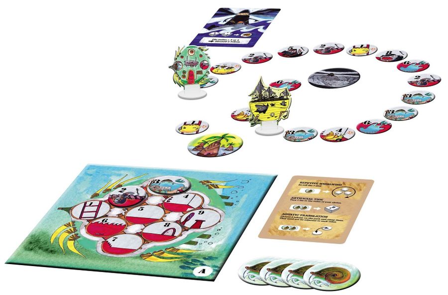 Each turn, you roll three dice and give one to each of these figures: the Nautilion, the Phantom Submarine, and the Darkhouse. The dice of the Nautilion and the Phantom Submarine move those figures along a path formed by Crew tokens: the Nautilion from the Happy Isles towards the Abyss; the Phantom Submarine in the opposite direction. The crew token on which your Nautilion ends its move joins your submarine, the one the Phantom Submarine reaches is lost!