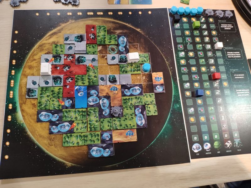 Each player has a goal of developing the best planet in Planet Unknown. Each round, each player will place one dual resourced tile on their planet, which is a polyomino shape. Each resource represents the infrastructure needed to support life on the planet. Every tile placement is important to cover your planet efficiently and also to build up your planet's engine. After placing the tile, players do two actions associated with the two infrastructure types on the tile. Be careful because some tile placements will trigger "meteors" that make all planets harder to develop and prevent it from scoring points in its row AND column.