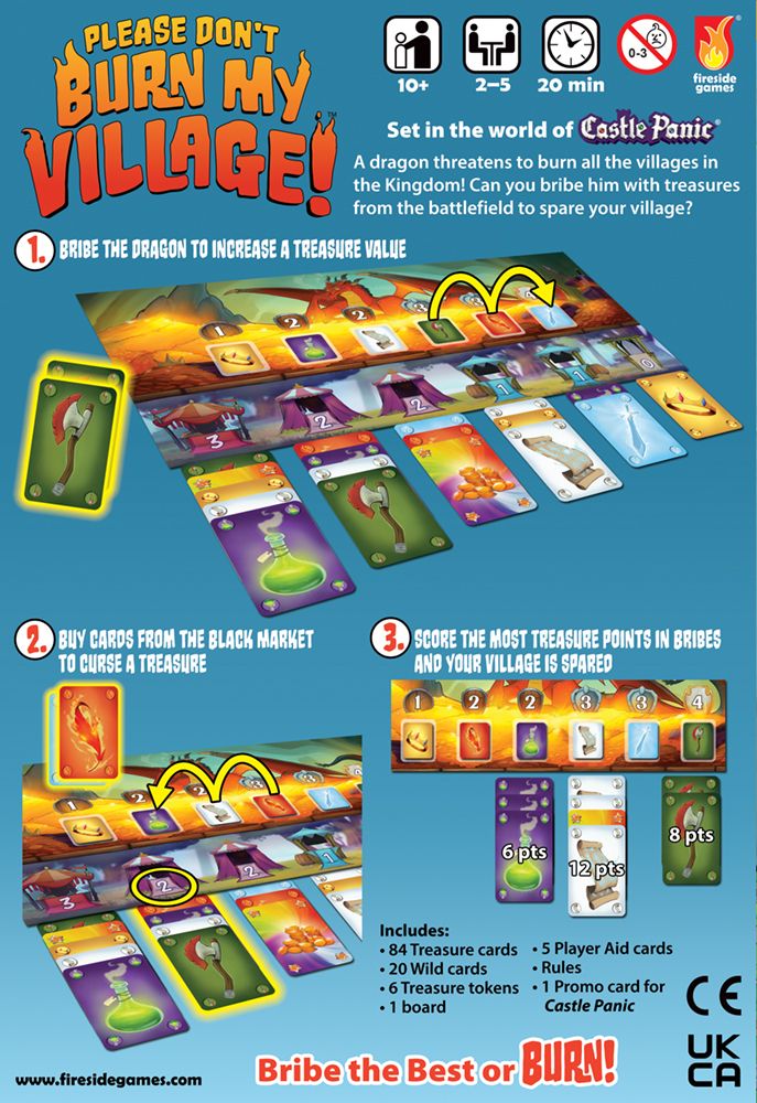 In Please Don't Burn My Village!, which is set in the world of Castle Panic, you want to bribe with the right treasure at the right time to keep the dragon's attention — while buying treasures at the black market and cursing the other villagers' treasures. When no treasure remains, the dragon will burn all of the villages except one. Will yours be the one that survives?