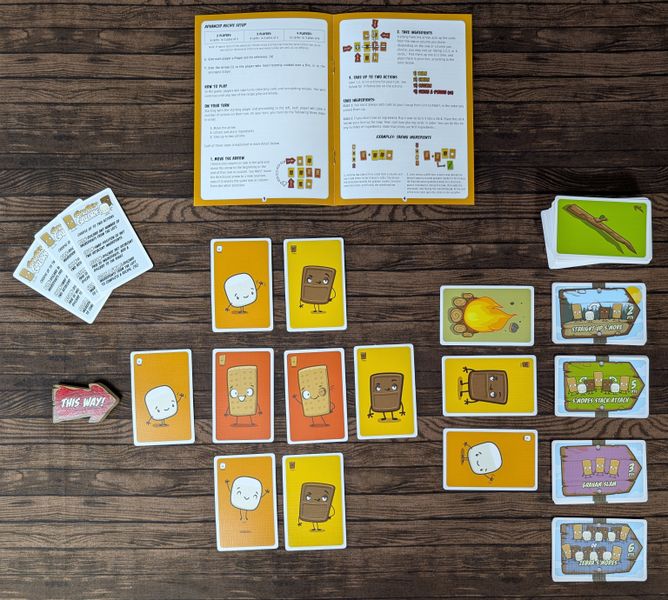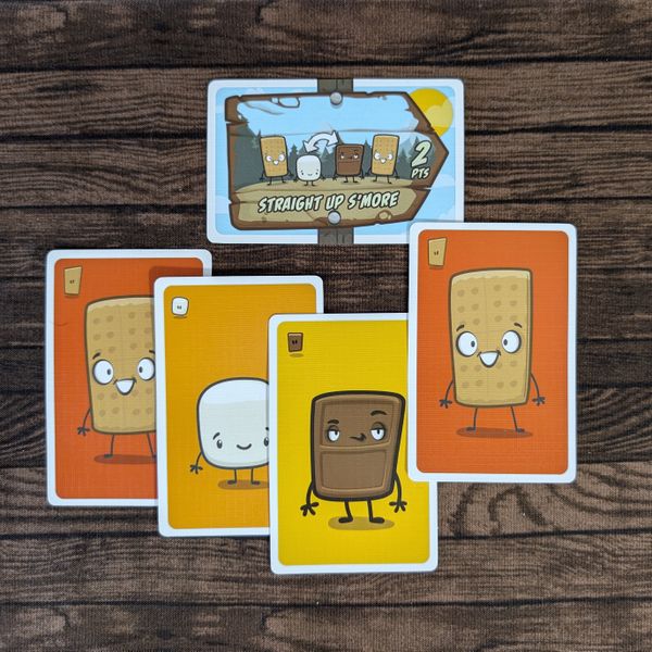 In S’mores Galore players compete to score the most point. You score points by making S'mores. To make S'mores, you'll first have to grab graham cracker, chocolate, and marshmallow cards from a grid on the table. You'll have to stack them to your line-up in the order you pick them up to create the perfect S’mores. With some clever hand management, you can score a lot of S'mores and win the game.