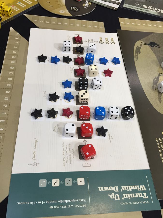 The game takes place over six rounds, a.k.a. "songs". Each song, players count down, then roll and place dice in real time to gain symbols and create patterns. When one player has placed all four of their dice, they shout "Take it to the bridge!" and other players must stop re-rolling and place the remainder of their dice. After placing all of their dice, each player can add the shape that their dice formed to their instrument's unique solo board, each of which offers a different challenge and way of scoring. Players can use symbols gained via the song and their solo boards to quickly change their dice, keep them for endgame scoring, or spend them to buy audience cards, each of which represents a newly-gained fan who will give you another way of scoring points at game's end.