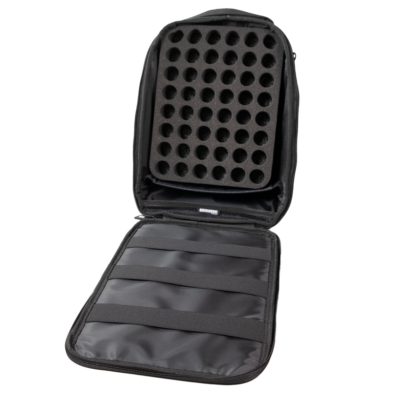The MINI has two hook & loop "wings" that deploy to attach to the back of either the GoBag EVO or NEO and can also just be carried on its own. Heavy duty construction with zippered closure and extra thick foam on the lid to keep minis in place while on the move.