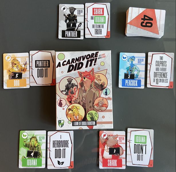 A Carnivore Did It! promises a guilty meat-eater, but you will have to determine the culprit for yourself. Maybe an herbivore was actually behind the crime, or perhaps you're searching for two culprits — or even three? For each case in this co-operative game, you're given a number of suspects, with each suspect being assigned a statement, e.g., "Shark is telling the truth" or "A carnivore did it". You know how many culprits you're looking for, and you have some idea of how truthful everyone is being. Perhaps only one suspect is lying, or perhaps 3-4 of them are telling the truth. Putting all of this information together, can you determine who did the crime? A Carnivore Did It! includes two thousand cases, each with a single solution, with the difficulty increasing to have up to seven suspects, conditional statements, and varying levels of truthiness. Also included is a campaign mode that links several cases together, with you scoring in them based on the amount of time it takes to find each solution...if you find them at all.