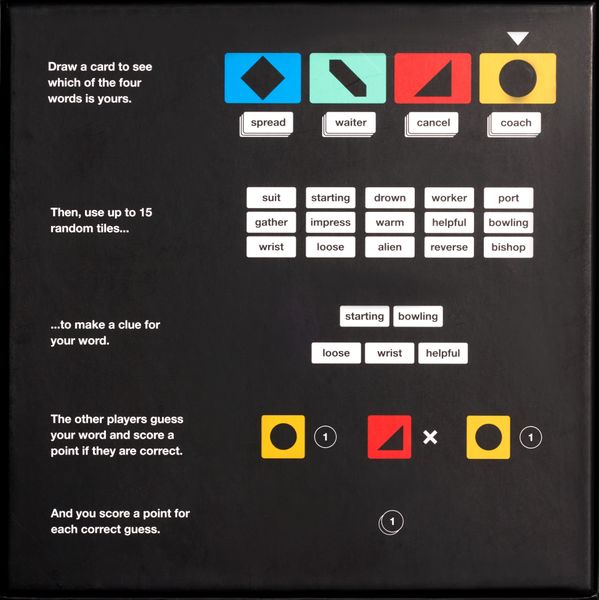 Each round, every player uses 15 random word tiles to make a clue for one of the four words in the center of the table. When everyone has finished, the group reads the clues out loud, and everyone guesses which of the four words belongs to each player. If a player guesses correctly, they score a point for themselves and a point for the author of the clue.