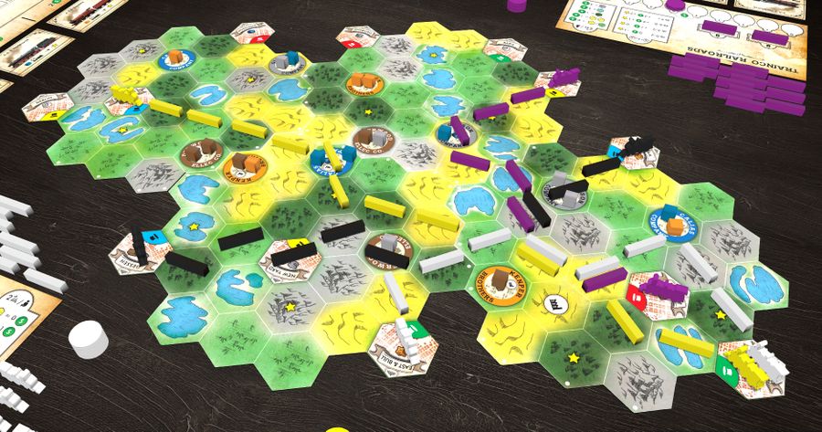 During their turn, players will build their tracks by placing 2 trains on the modular board. When building tracks, players must pay the gold costs for the different terrain that the track passes through. Once a track connects an industry that produces a good with a city that demands that certain good, the player may send a train to complete the delivery and earn gold depending on the track length.