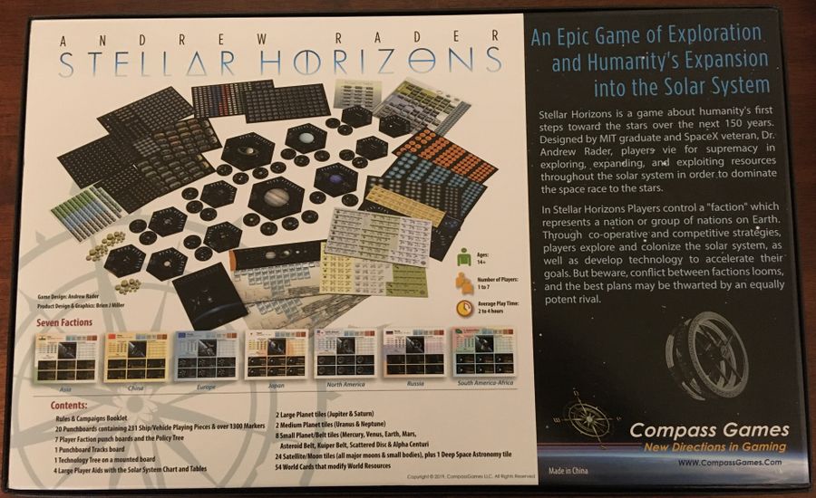 Stellar Horizons includes short co-operative and competitive scenarios lasting an hour or more, and campaigns lasting a day up to about a full weekend for experienced players. Up to seven players can play at a time and the game is most fun with at least two, but there are also one-player scenarios, and the campaigns are highly suited for solo play. There are three ways to win the campaign: be the first to develop an Interstellar Colonizer, terraform a world, or achieve dominance in space over your rivals.
